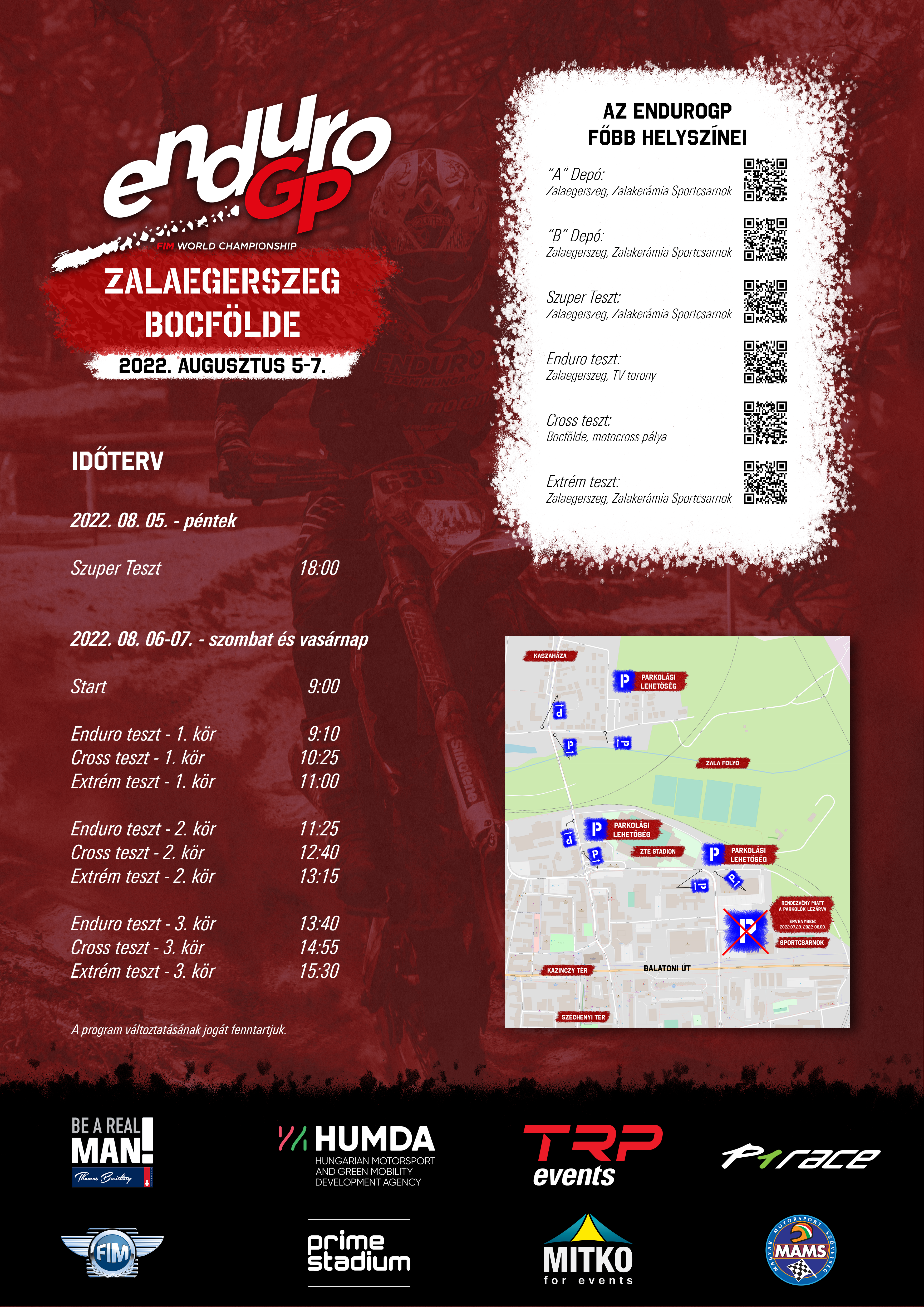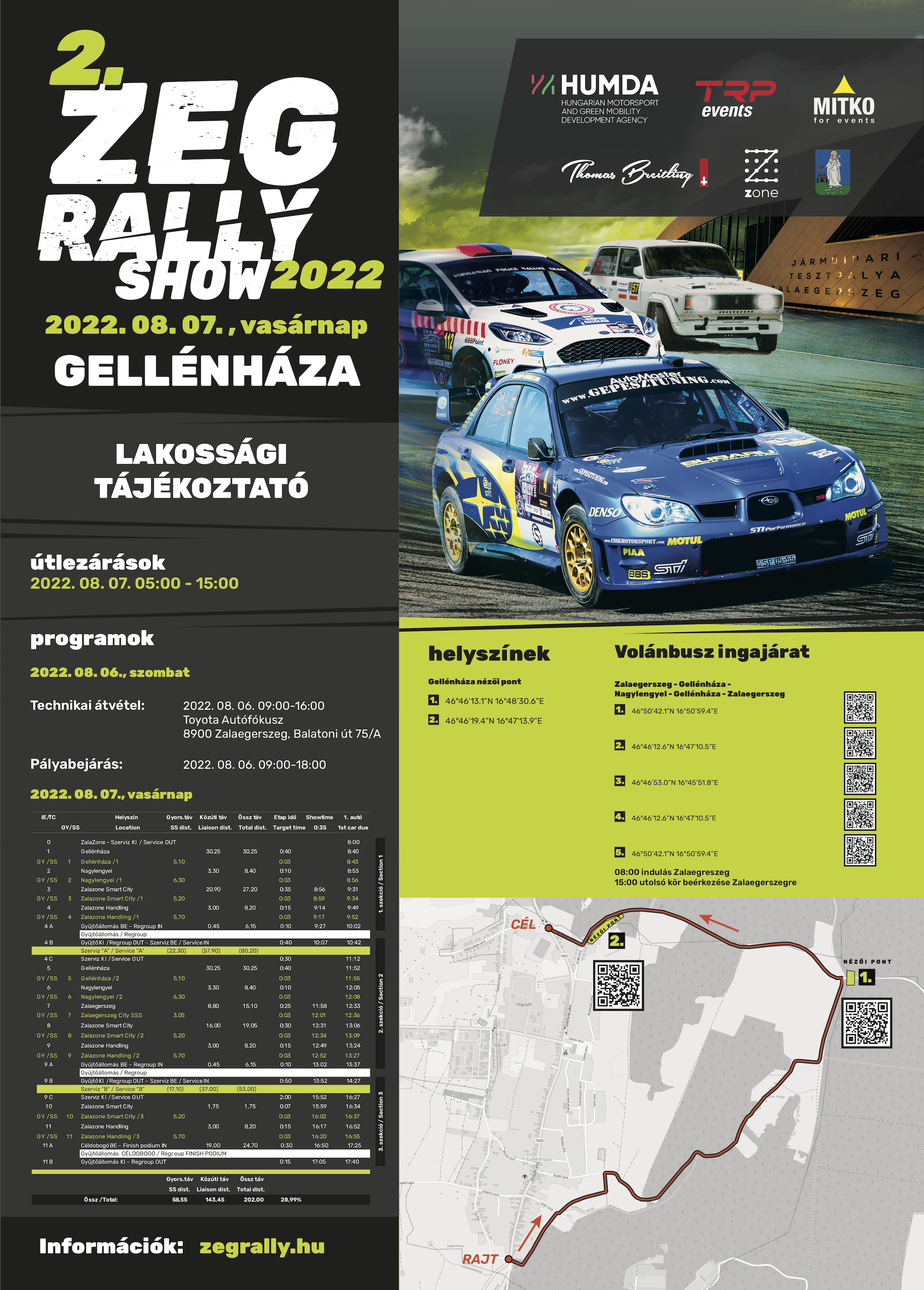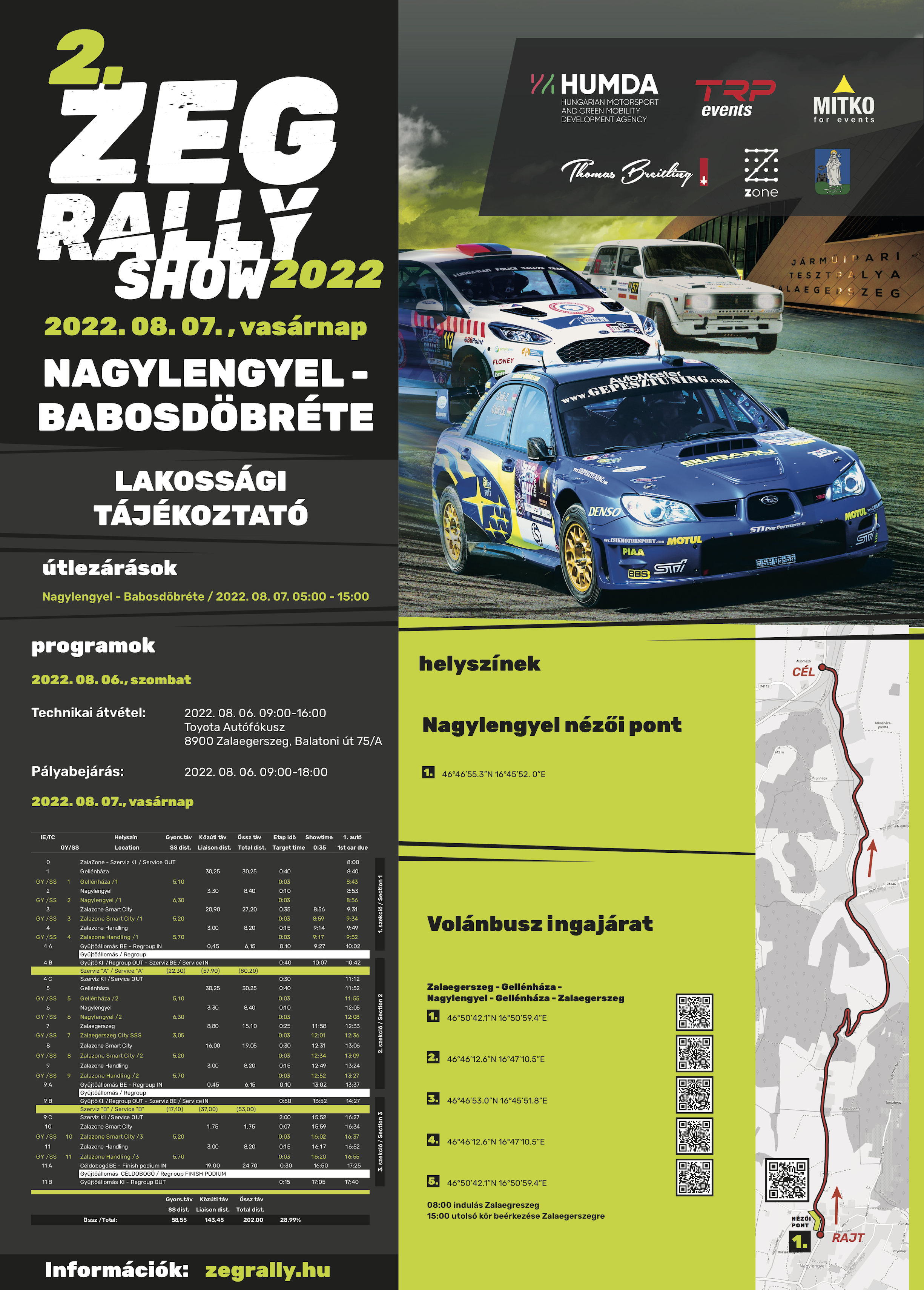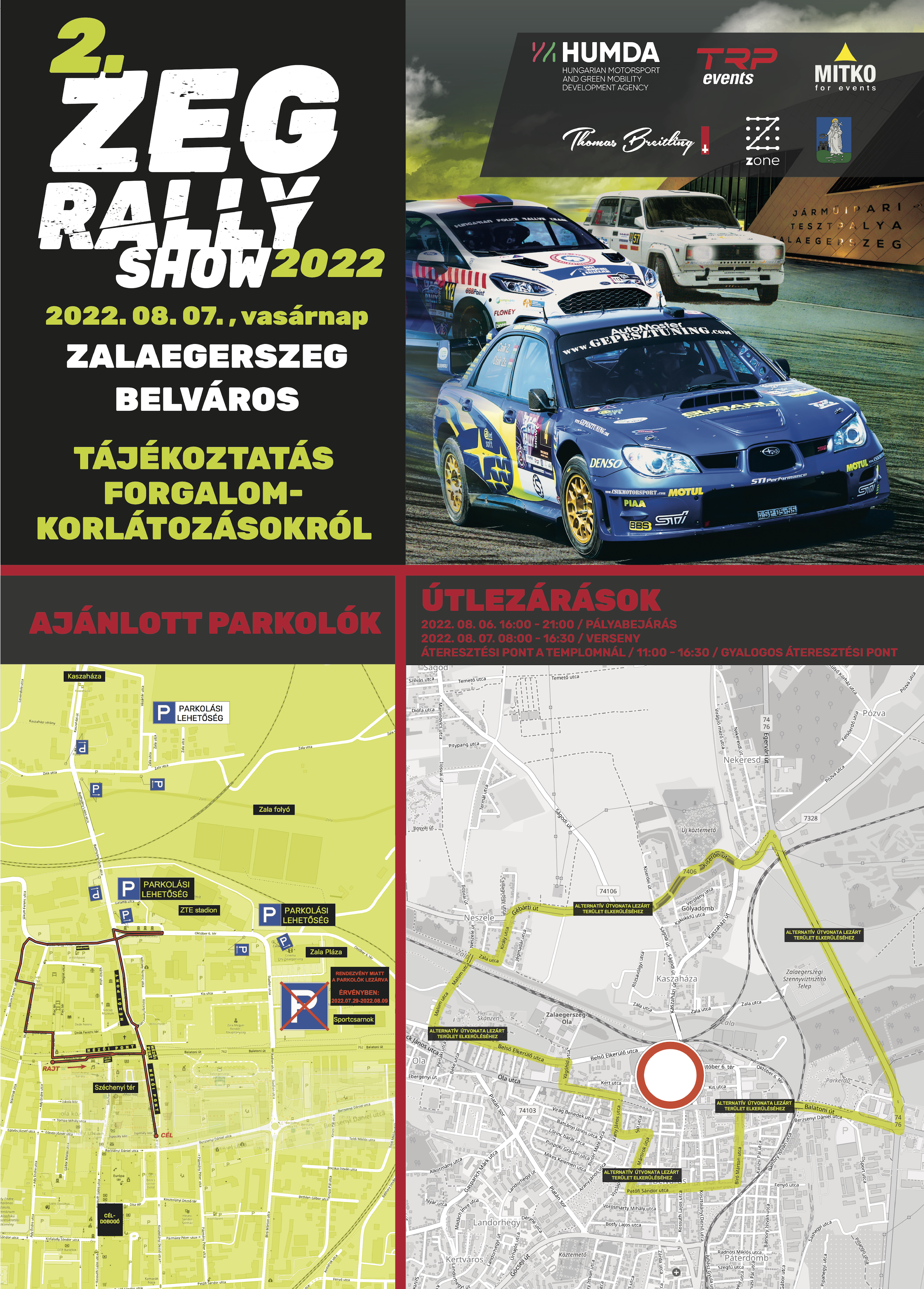 Zalaegerszegen vasárnap a képen látható nyomvonalon zajlik a verseny, a parkolásra két nagyobb és négy kisebb parkoló ajánlott. Az útlezárások 2022.08.06-án 16:00 – 21:00-ig a pályabejárás ideje alatt, és 2022. 08. 07-én 08:00–16:30-ig a verseny ideje alatt lesznek. Gyalogos áteresztési pont a templomnál lesz 11:00 és 16:30 között.